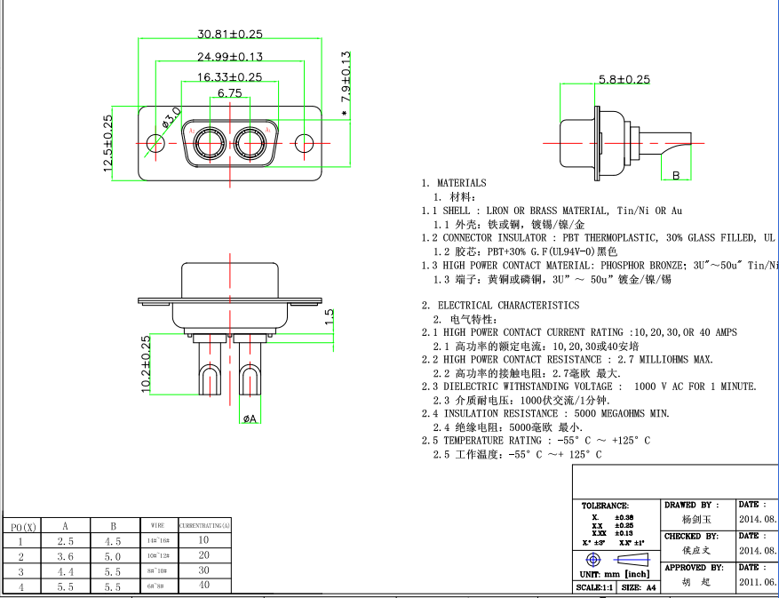 D型 2芯 30A 矩形航空插頭,參照GJB142A標(biāo)準(zhǔn),該類產(chǎn)品型號種類多,有大電流,有混裝大小電流的,客戶可根據(jù)實際情況選用,具體介紹如下: