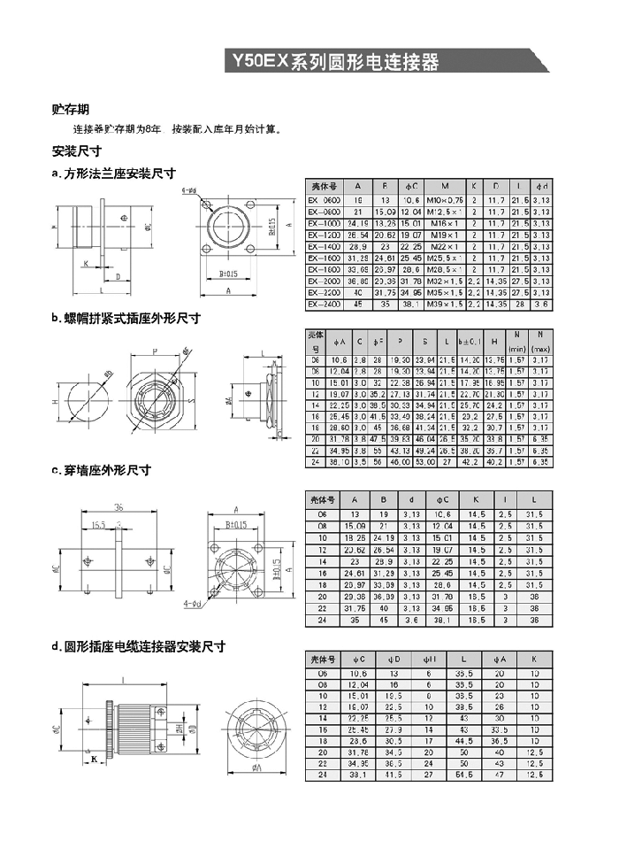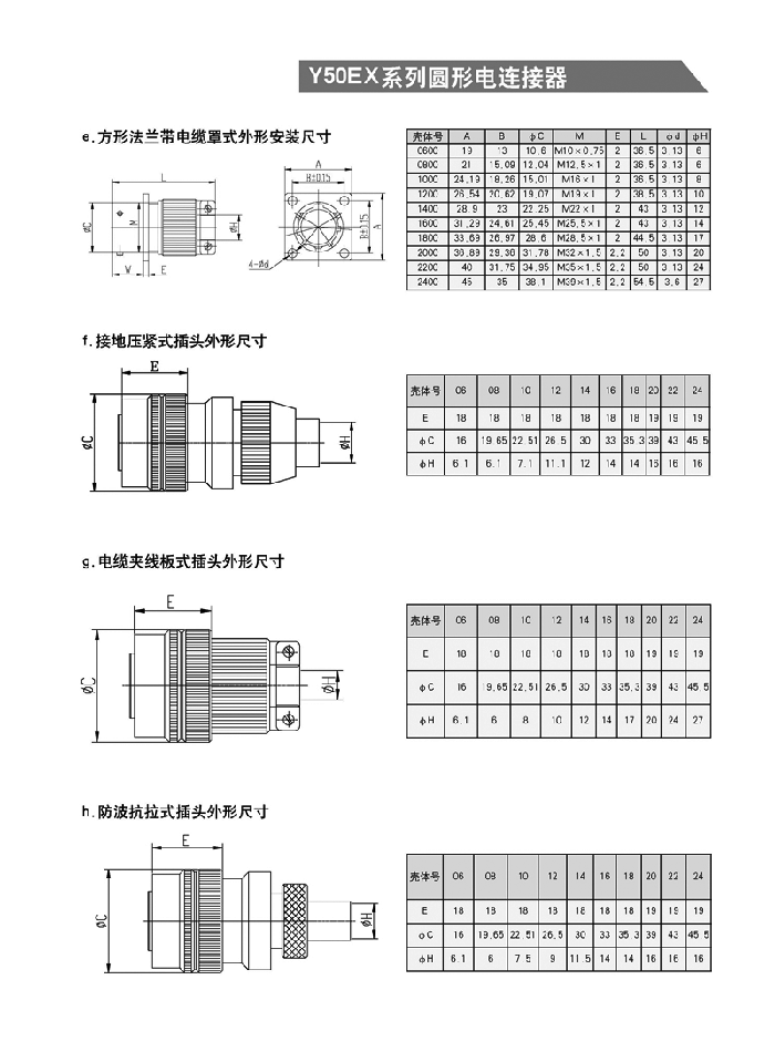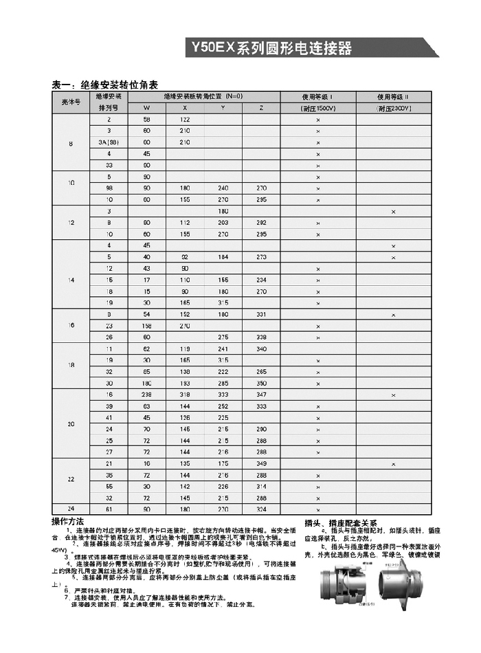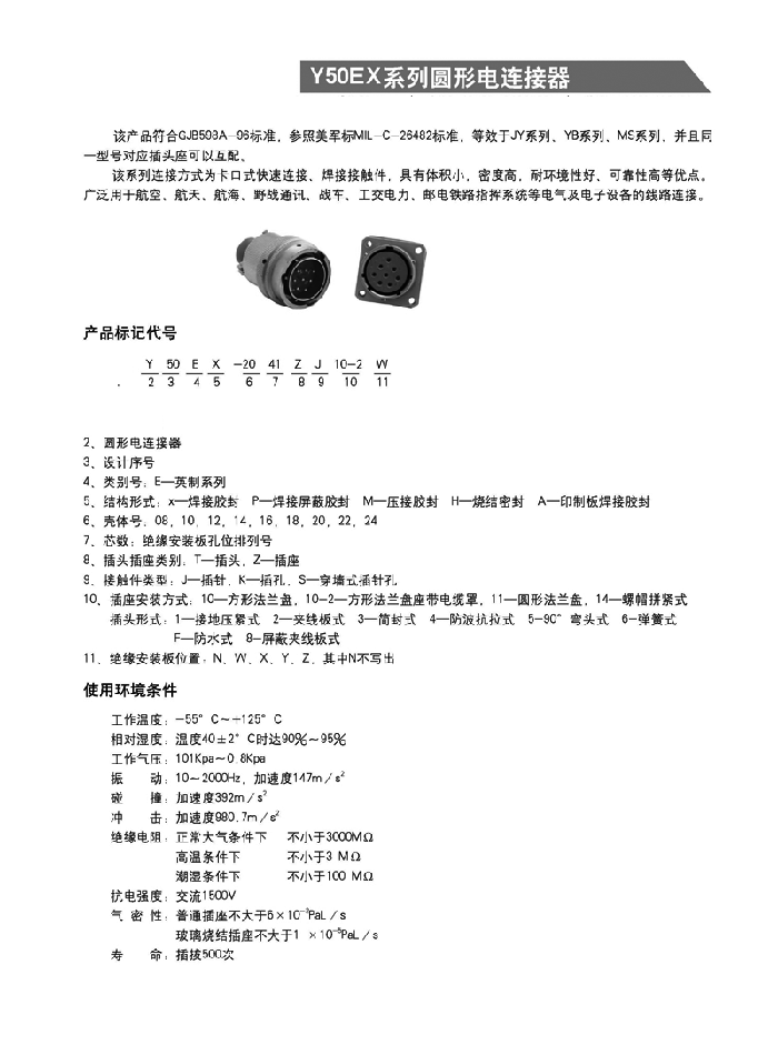 Y50EX系列圓形航空頭采用卡口式連接系統(tǒng),具有快速控接和快速分離,體積小、重量輕等特點(diǎn)。插頭有多種電纜安裝形式,即:電纜夾線板式、簡易封裝式、接地壓緊式、防波抗拉式、彎頭護(hù)線式、電纜話筒式和彈簧護(hù)線式等。電纜出線口備有各種規(guī)格不同的密封橡膠護(hù)線縣,能與電纜線緊密配接,增強(qiáng)了電纜線和連接器插頭的防雨、防水、防塵密封性和抗拉性能。接觸件焊接,殼體有屏蔽和非屏蔽以及多種鍍層可選,插座有一般密封和玻璃燒結(jié)密封等類觀,以適用不同的工作環(huán)境。適用于戰(zhàn)略戰(zhàn)術(shù)系統(tǒng),電子對抗系統(tǒng),野外作業(yè)電能,通訊信號(hào)連接系統(tǒng),航大航空航海通訊和測試跟蹤系統(tǒng),計(jì)算機(jī)系統(tǒng)、郵電鐵路指揮系統(tǒng),進(jìn)口醫(yī)療儀器設(shè)備等電能、電訊信號(hào)的近接。