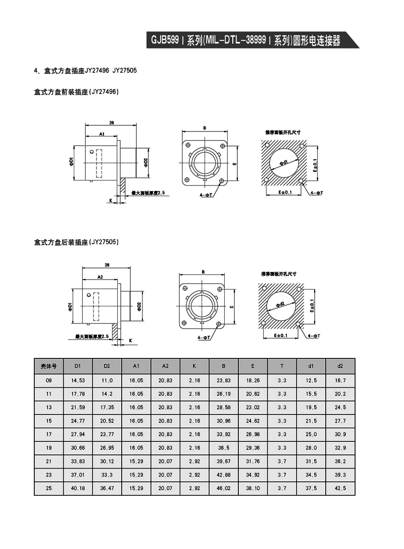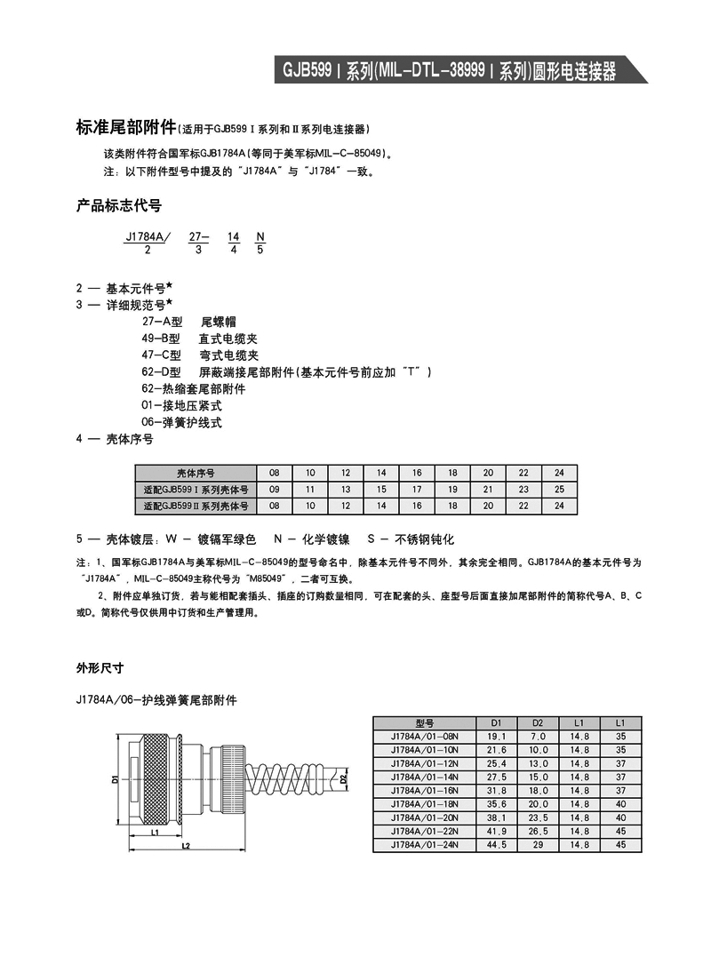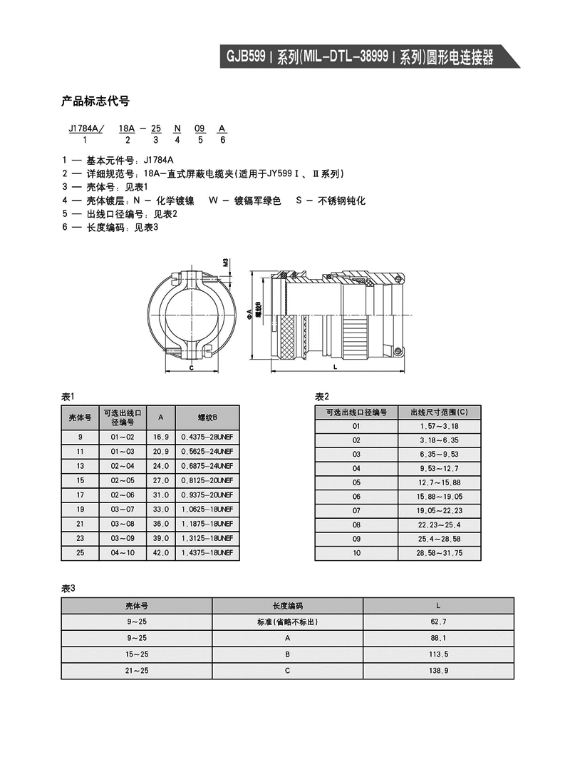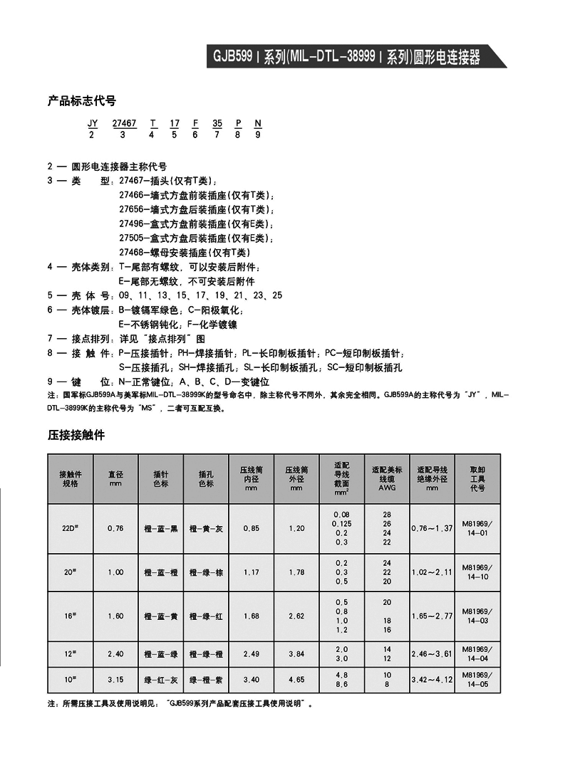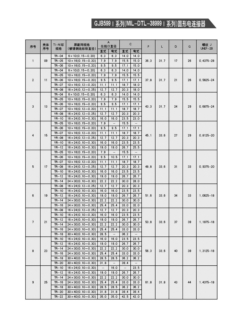 * 符合GJB 599A(MIL-DTL-38999K)Ⅰ 系列 * 卡口式快速連接 * 體積小,重量輕,接觸偶密度高 * EMI / RFI 屏蔽 * 接觸件壓接可取卸,防斜插設(shè)計 * 插座有盒式、墻式、前裝、后裝及螺母緊固式安裝等多種形式 * 具有抗高強度振動特性 * 符合GJB 1784A的標(biāo)準(zhǔn)尾部附件 * 適用于屏蔽電纜夾緊的專用尾部附件(Ti-Ni合金記憶環(huán)) * 9種殼體號,74種孔組排列 * 插合面界面及尾部具有密封結(jié)構(gòu),三防性能優(yōu)良,防護等級可達到IP65 * 五鍵位導(dǎo)向機構(gòu),有五種防錯插鍵位 * 廣泛應(yīng)用于航空、航天、兵器等軍事系統(tǒng)及其他電子設(shè)備系統(tǒng)