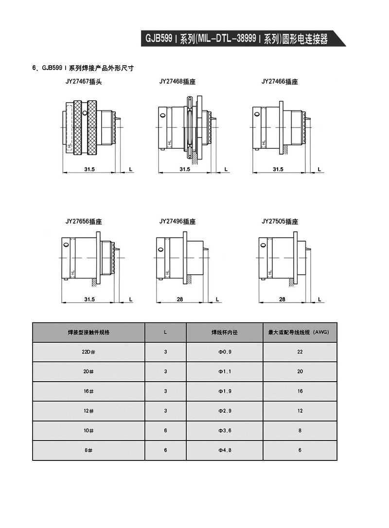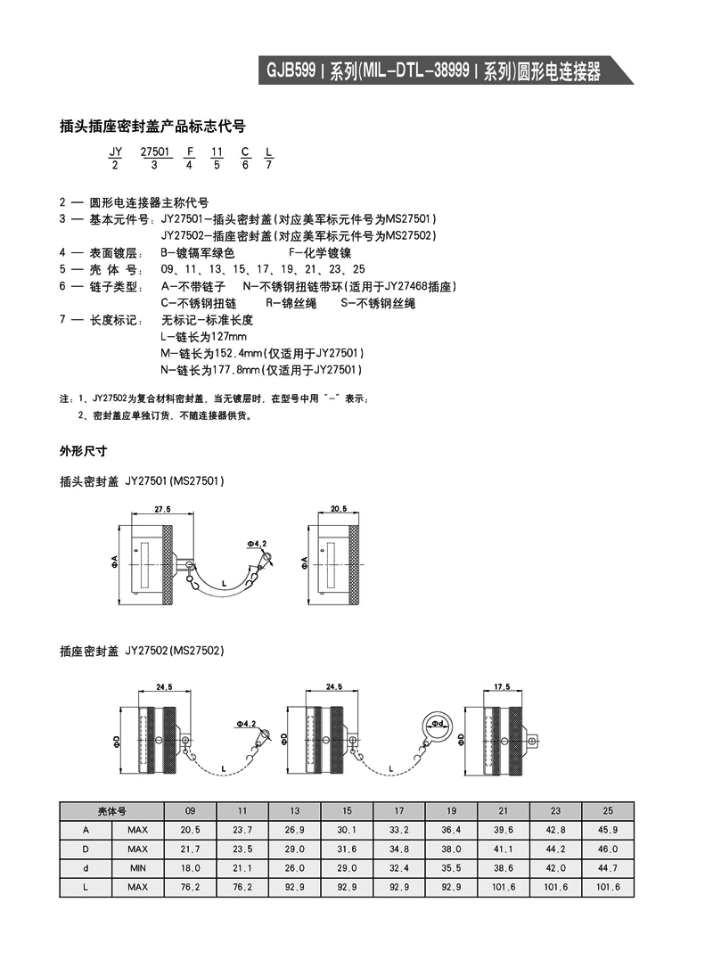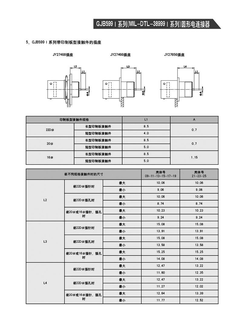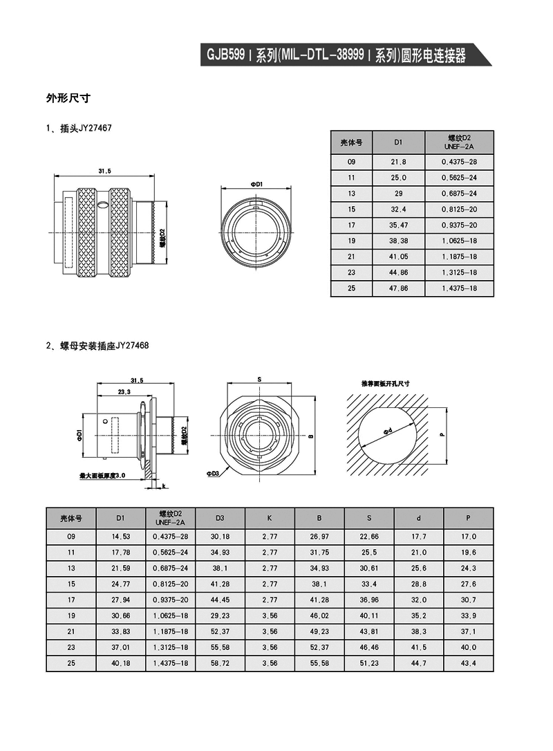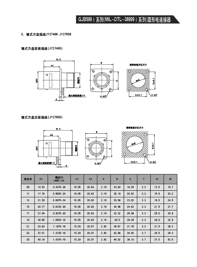 * 符合GJB 599A(MIL-DTL-38999K)Ⅰ 系列 * 卡口式快速連接 * 體積小,重量輕,接觸偶密度高 * EMI / RFI 屏蔽 * 接觸件壓接可取卸,防斜插設(shè)計 * 插座有盒式、墻式、前裝、后裝及螺母緊固式安裝等多種形式 * 具有抗高強度振動特性 * 符合GJB 1784A的標(biāo)準(zhǔn)尾部附件 * 適用于屏蔽電纜夾緊的專用尾部附件(Ti-Ni合金記憶環(huán)) * 9種殼體號,74種孔組排列 * 插合面界面及尾部具有密封結(jié)構(gòu),三防性能優(yōu)良,防護等級可達到IP65 * 五鍵位導(dǎo)向機構(gòu),有五種防錯插鍵位 * 廣泛應(yīng)用于航空、航天、兵器等軍事系統(tǒng)及其他電子設(shè)備系統(tǒng)