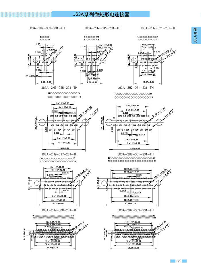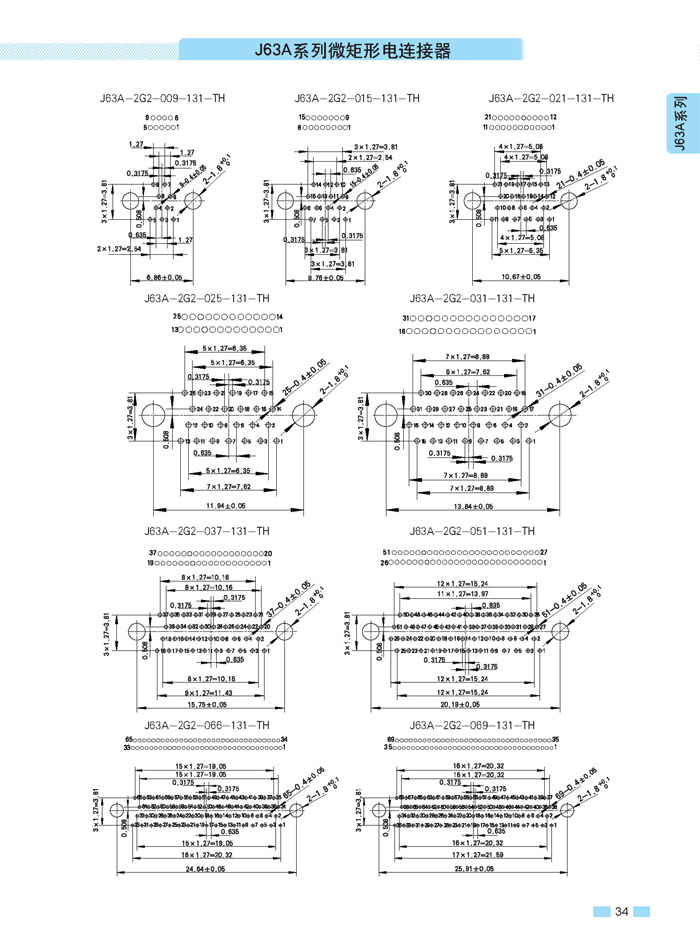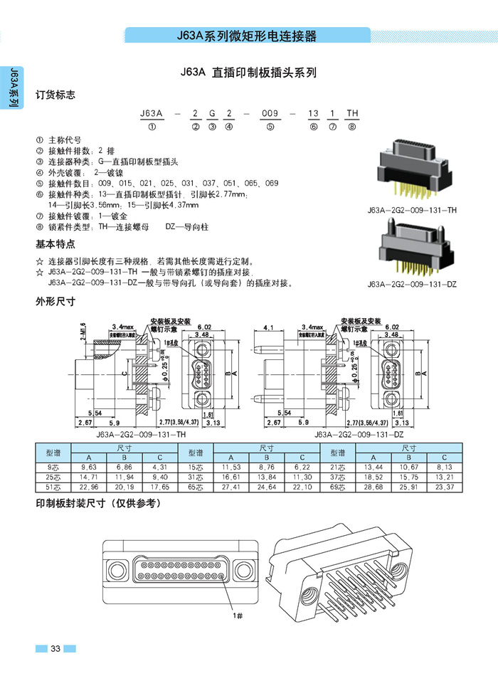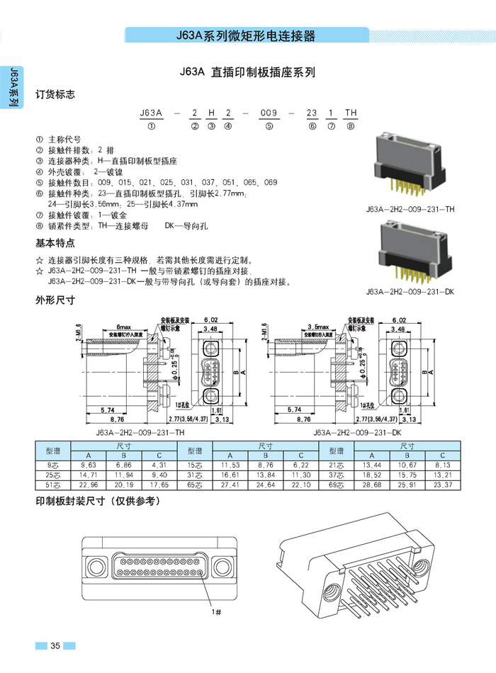 J63A 型90°彎插印制板航空連接器,端接方式是印制板,而且是90°彎腳,座殼體與墻體正常安裝,印制板平行放置,與插針直接焊接。要說明的是印制板可以立著放,這時(shí)選用直式插針焊接。以下是選購(gòu)圖: