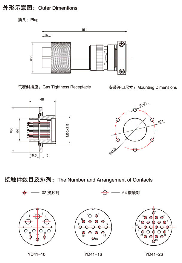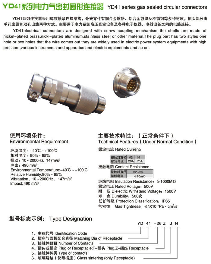 YD41系列連接器采用螺紋鎖緊連接結(jié)構(gòu),外殼零件有銅合金鍍鉻、鋁合金鍍鎳及不銹鋼等多種材質(zhì)。插頭部分由單孔出線和雙孔出線兩種方式,插座分為注塑與玻璃燒結(jié)兩種形式,其中玻璃燒結(jié)成型工藝,大大提高了氣密性(1X10%*p-4%*p %*bPa·cm%*p3%*p %*b/s)。主要用于電力系統(tǒng)高壓真空設(shè)備及各種電子儀器、電器設(shè)備之間的電路連接,在高壓斷路器及各種充氣柜中應(yīng)用廣泛。