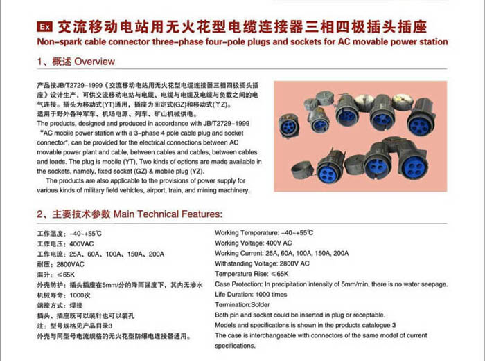 4芯300A防爆防火花航空電連接器,由插頭和插座兩部分組成,其中插頭為移動(dòng)式(YT),插座有3種形式選擇:①面板固定式(GZ)、②移動(dòng)式(YZ)和③斜式固定式。