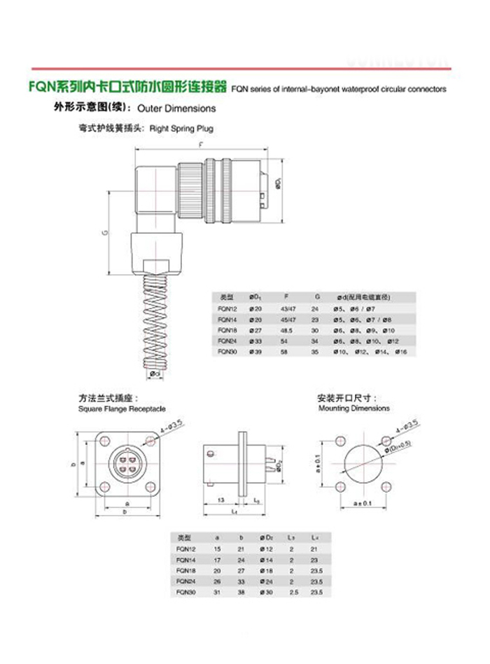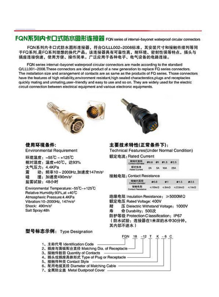 FQN型防淋雨防塵室外航空插頭座,符合Q/LLL002-2008標(biāo)準(zhǔn),產(chǎn)品價(jià)格的安裝尺寸及接點(diǎn)型譜等同F(xiàn)Q和Q系列產(chǎn)品價(jià)格,是FQ系列產(chǎn)品價(jià)格的改進(jìn)型。體積小,重量輕,內(nèi)卡口快速連接,零件由鋁棒或銅棒車(chē)加工制造(非鋁壓鑄件),耐環(huán)境,防水、防鹽霧、防霉菌,操作使用簡(jiǎn)便。插針、插孔引線采用焊接式。產(chǎn)品價(jià)格被廣泛使用于各種電子儀器、電子、電氣設(shè)備間有防水要求的電連接中。產(chǎn)品價(jià)格符合按鐵道部標(biāo)準(zhǔn)TB/T2761。產(chǎn)品價(jià)格針、孔可以根據(jù)您的要求互換。