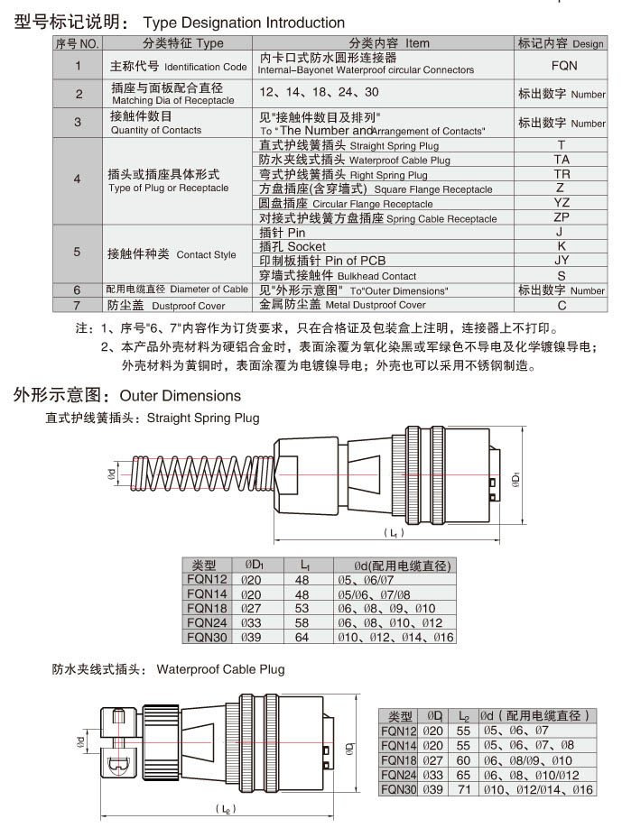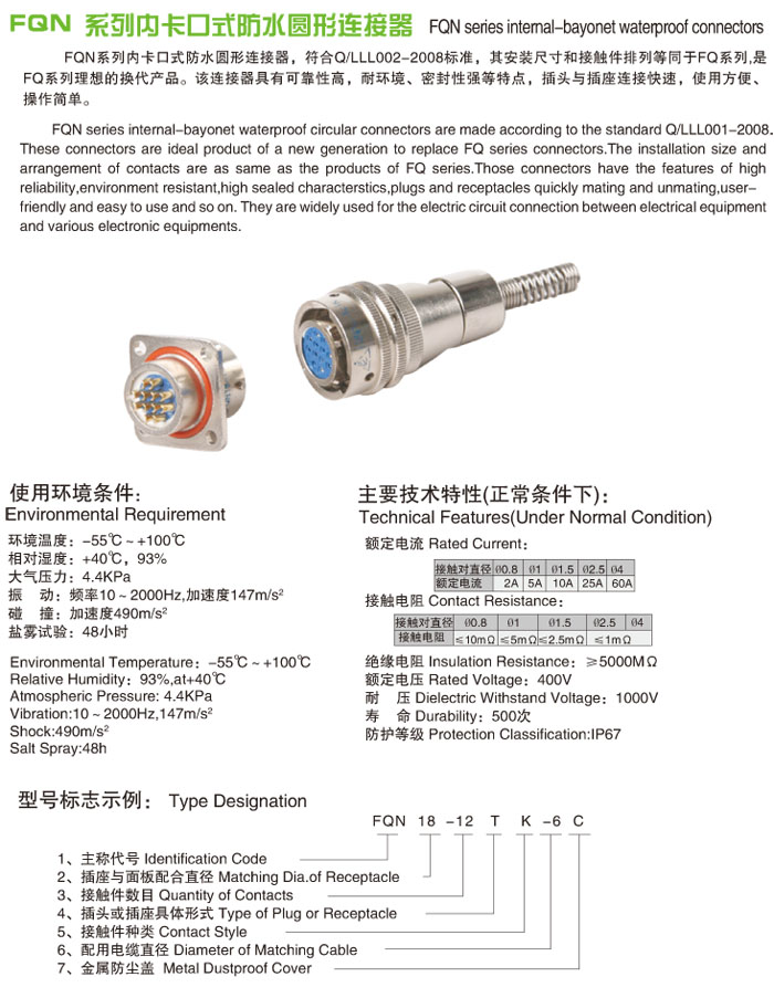 FQN系列內(nèi)卡口式防水型圓形電連接器,符合Q/LLL002-2008標(biāo)準(zhǔn),產(chǎn)品的安裝尺寸及接點(diǎn)型譜等同F(xiàn)Q和Q系列產(chǎn)品價(jià)格,是FQ系列產(chǎn)品價(jià)格的改進(jìn)型。體積小,重量輕,內(nèi)卡口快速連接,零件由鋁棒或銅棒車(chē)加工制造(非鋁壓鑄件),耐環(huán)境,防水、防鹽霧、防霉菌,操作使用簡(jiǎn)便。插針、插孔引線采用焊接式。產(chǎn)品價(jià)格被廣泛使用于各種電子儀器、電子、電氣設(shè)備間有防水要求的電連接中。產(chǎn)品價(jià)格符合按鐵道部標(biāo)準(zhǔn)TB/T2761。產(chǎn)品價(jià)格針、孔可以根據(jù)您的要求互換。