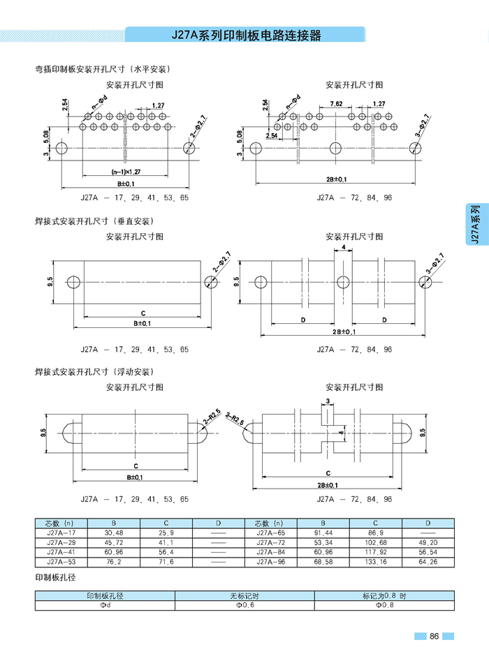 J27A系列印制板電路連接器,符合IEC130標(biāo)準(zhǔn)和MIL-C-55302標(biāo)準(zhǔn)要求,接觸數(shù)目有17,29,41,53,65,72,84,96芯等規(guī)格,連接器尾端端接形式分為直插印制板式、彎插印制板式、焊接式和壓接式,安裝鎖緊形式靈活,定位導(dǎo)向裝置有36種方位組合,具有很強(qiáng)的防誤插功能。http://www.jshkdz.com/product.asp?parentid=2
