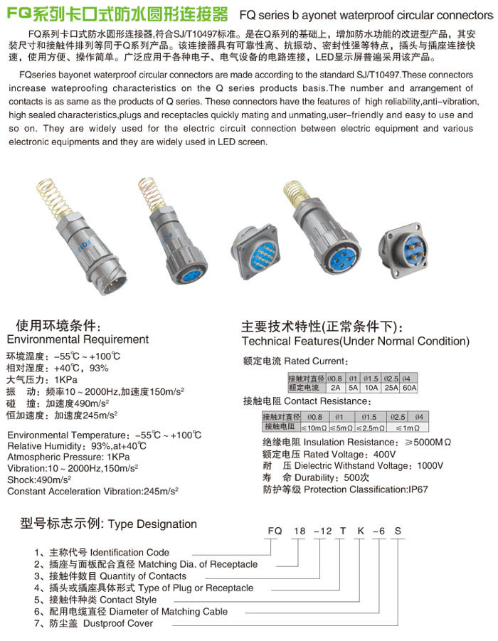 FQ 系列防水圓形電連接器符合電子工業(yè)部元器件工業(yè)管理局局標(biāo)準(zhǔn)DZ4Q/RE008-84制造,產(chǎn)品結(jié)構(gòu)先進(jìn),可靠性高,插孔接觸采用高可靠的鼠籠式彈性接觸代替?zhèn)鹘y(tǒng)的線簧結(jié)構(gòu),產(chǎn)品具有接觸電阻小、抗振動、耐沖擊、密封性強等特點,插頭座連接為卡口式快速連接,使用簡單,操作方便,被廣泛應(yīng)用于各種電子設(shè)備間的電氣連接。
