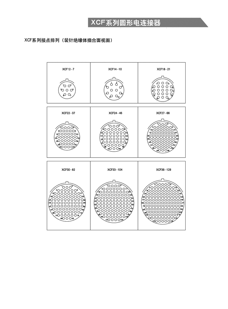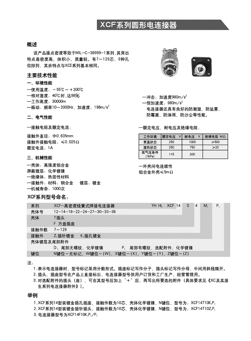 XCF系列高密度航空插頭, XCF系列軍用圓形電連接器 ,等效于MIL-C-38999-I系列標(biāo)準(zhǔn),具有密度高、體積小,重量輕等特點(diǎn),殼體為高強(qiáng)度鋁合金材料,插頭、插座既可裝針也可裝孔,其連接方式為卡口式快速連接和分離,操作方便,連接牢靠,抗振耐沖,接觸件有焊接式,其中插孔為線簧孔,具有插拔柔和、接觸電阻小、防潮、防鹽霧、防霉菌、防淋雨等特性,主要應(yīng)用于艦船等各種惡劣環(huán)境領(lǐng)域,也可應(yīng)用于航空、航天、兵器、野戰(zhàn)通信等軍事領(lǐng)域以及郵電通訊、鐵路指揮系統(tǒng)、計算機(jī)、航海和各種儀器、儀表的線路連接。