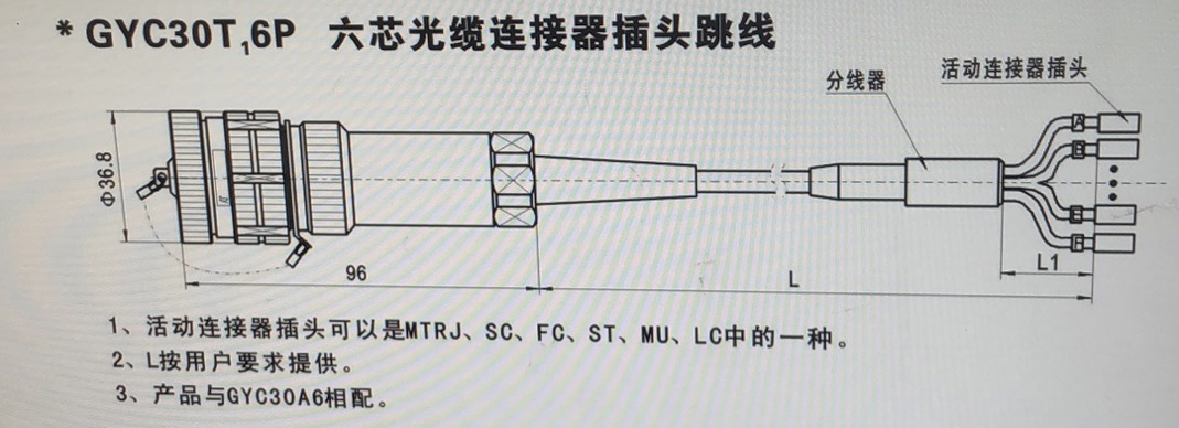 GYC30T36P-6FC-C6*6-3S5/0.3光纖連接器介紹 GYC30T36P-6FC-C6*6-3S5/0.3光纖連接器,看起來復(fù)雜,扯開說明一下,也許便于大家選用。GYC30是公司命名型號。 T3和T1都是表示尾部,長短不一樣。6FC-C6*6表示6毫米光纜線,帶6根跳線。3S5/0.3表示主線5米,跳線0.3米長。要說明 是光纜頭有多種型號,線長短可以選擇,不是固定的。